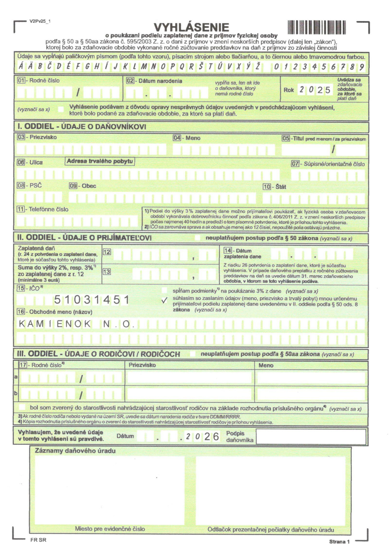Termín odovzdania je do 30.04.2026, ak ste tak ešte neurobili, veľmi poteší ak podporíte KAMIENOK n.o.